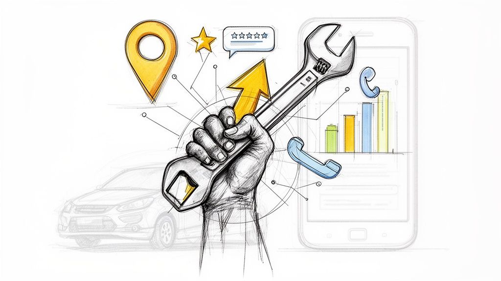 Effective marketing for an auto repair shop isn't about one magic bullet. It’s a powerful mix of a rock-solid digital presence, smart lead generation, and, most importantly, top-notch customer service. It all starts with making sure you show up first when a local driver needs help, and that begins with dominating Google.